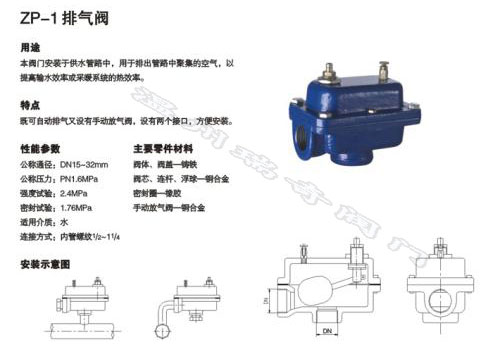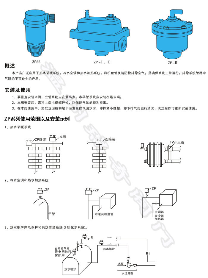 ZP-I、II方形臥式自動排氣閥廣泛應用于熱水采暖系統(tǒng),冷水空調和熱水加熱系統(tǒng),風機盤管及消防栓排除空氣。是確保系統(tǒng)正常運行,排除系統(tǒng)管路中氣阻的不可缺少的產品。