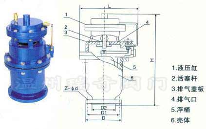 本閥由下閥體,中閥體,浮筒,浮筒桿,閥芯,蓋板,活塞桿,膜片及閥蓋等組成的全壓高速排氣閥,其特征是通過銷軸與浮筒鉸接的浮筒桿可繞主軸轉動,并由此實現通過浮筒升降控制閥芯的升降啟閉,即當浮筒下降(閥體里充滿氣體)時,閥芯上升,打開小閥口,并關閉小排氣帽上的排氣口,使氣體通過導管進入液壓罐內,當浮筒在浮力作用下上升時候,閥芯下降,關閉小閥口,同時打開排氣帽上的排氣口,使液壓罐通過導管,直通大氣泄壓,且當浮筒下降,液壓缸內充滿氣體時,閥門上的大排氣口自動關閉。當水泵停止,管內水流空時或遇到管內產生負壓時,吸入空氣,確保管線安全。